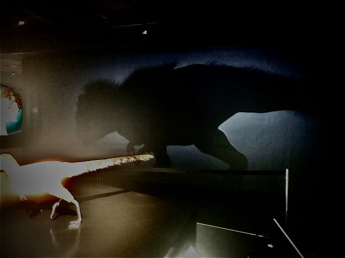 そして壁に映し出されたこの幼体のシルエットが成体のプロポーションに見えるというすごい演出。成長すると角の角度が変わっちゃうトリケラトプスでは難しそうです。