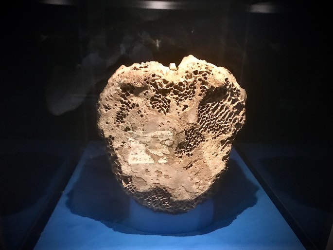 このスカスカのスポンジみたいな化石は、記録上世界で初めて発見されたティラノサウルスの骨で、脊椎の一部です。実物です。エドワード・コープ博士は1892年にこれにマノスポンディルス・ギガス Manospondylus gigas と命名しましたが、後にティラノサウルスと同一であることが指摘されるわけです。
