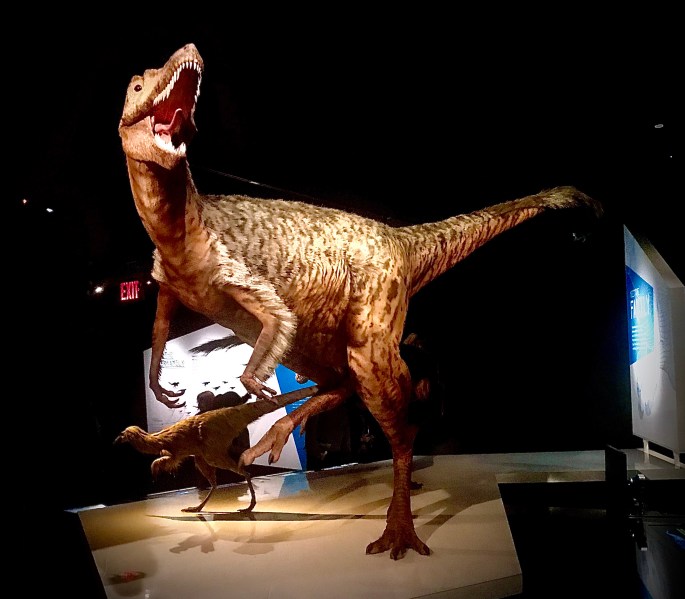 この可愛げのある鳥っぽい恐竜が最初に出迎えてくれるわけですが、こう見えましてもティラノサウルス Tyrannosaurus の生体復元模型です。ありがとうございます。もちろん幼体です。