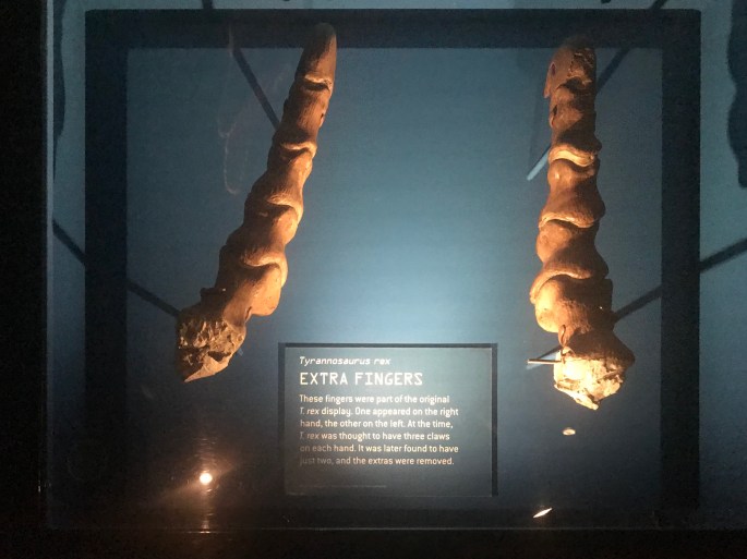 AMNH 5027 にもともと付けられていたという第3指。当初ティラノサウルスはより基盤的な獣脚類のように3本指だと思われていたのでそのように復元されていたのですが、2本指だとわかったので外された次第。