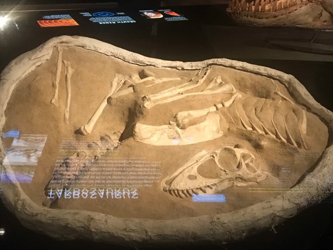 奥にはタルボサウルス大きめの亜成体の頭骨。ちなみにタルボサウルスは明確な成体が未発見で、ティラノサウルスは多くの標本が成体なんだそう。