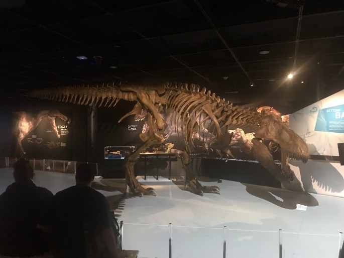 展示の目玉、ティラノサウルス成体(たぶんAMNH 5027)の前傾姿勢マウント。