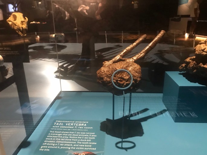 ティラノサウルスの歯がぶっ刺さったエドモントサウルス Edmontosaurus の尾椎。