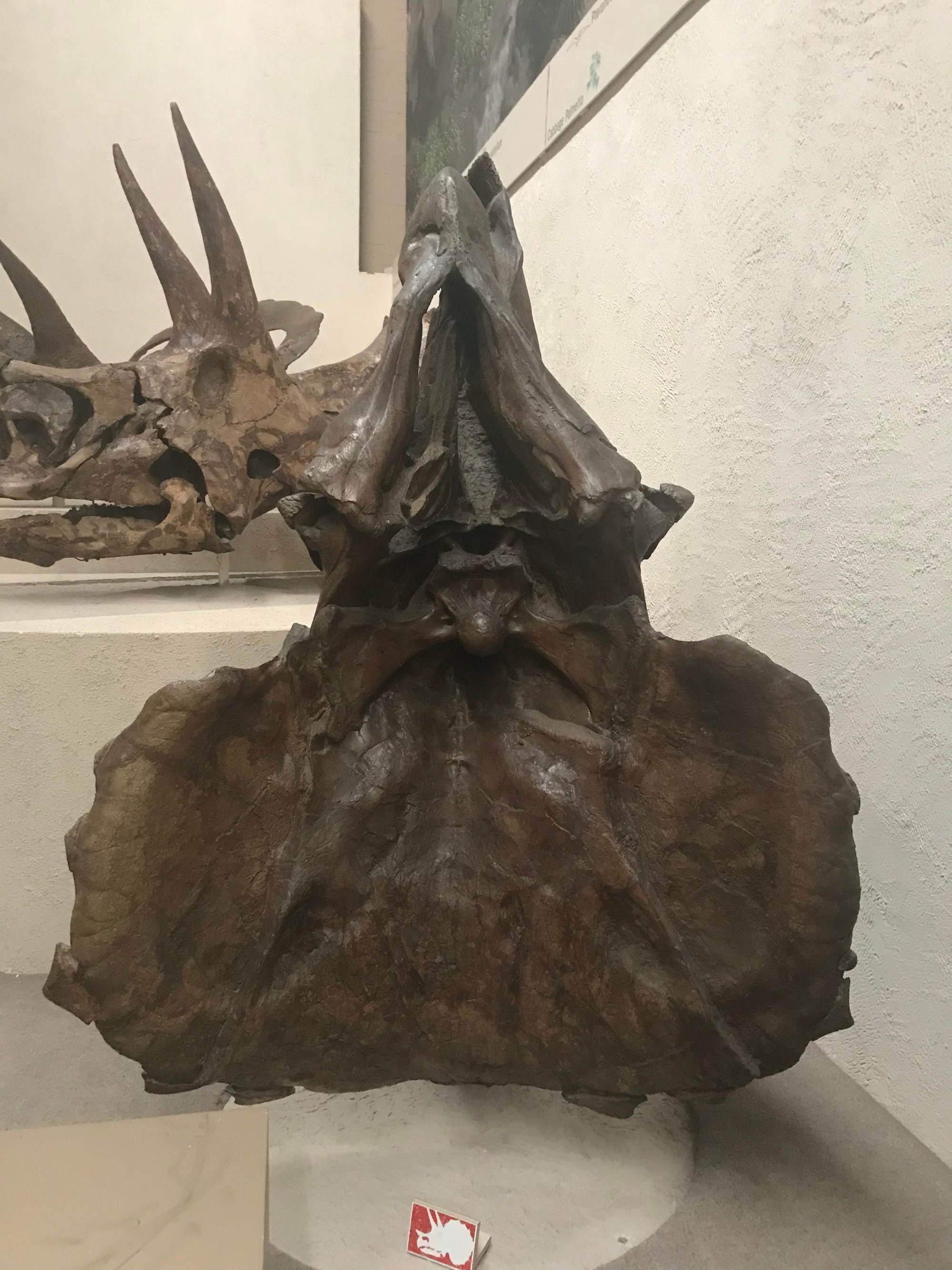 このアメリカ自然史博物館のトリケラトプス(AMNH 970、偶然なのか何なのかこれもセラトゥス種とされていた標本)と同じように上を向いた状態で展示されていて、よく保存された脳函や首の骨との接合部にあたるボールジョイント(後頭顆)が観察できます。