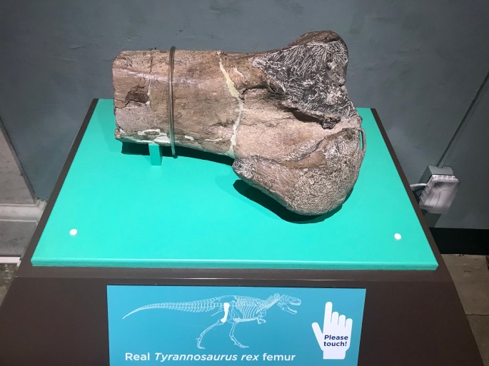 ついでにティラノサウルスの大腿骨。上半分です。お触りOKな実骨。