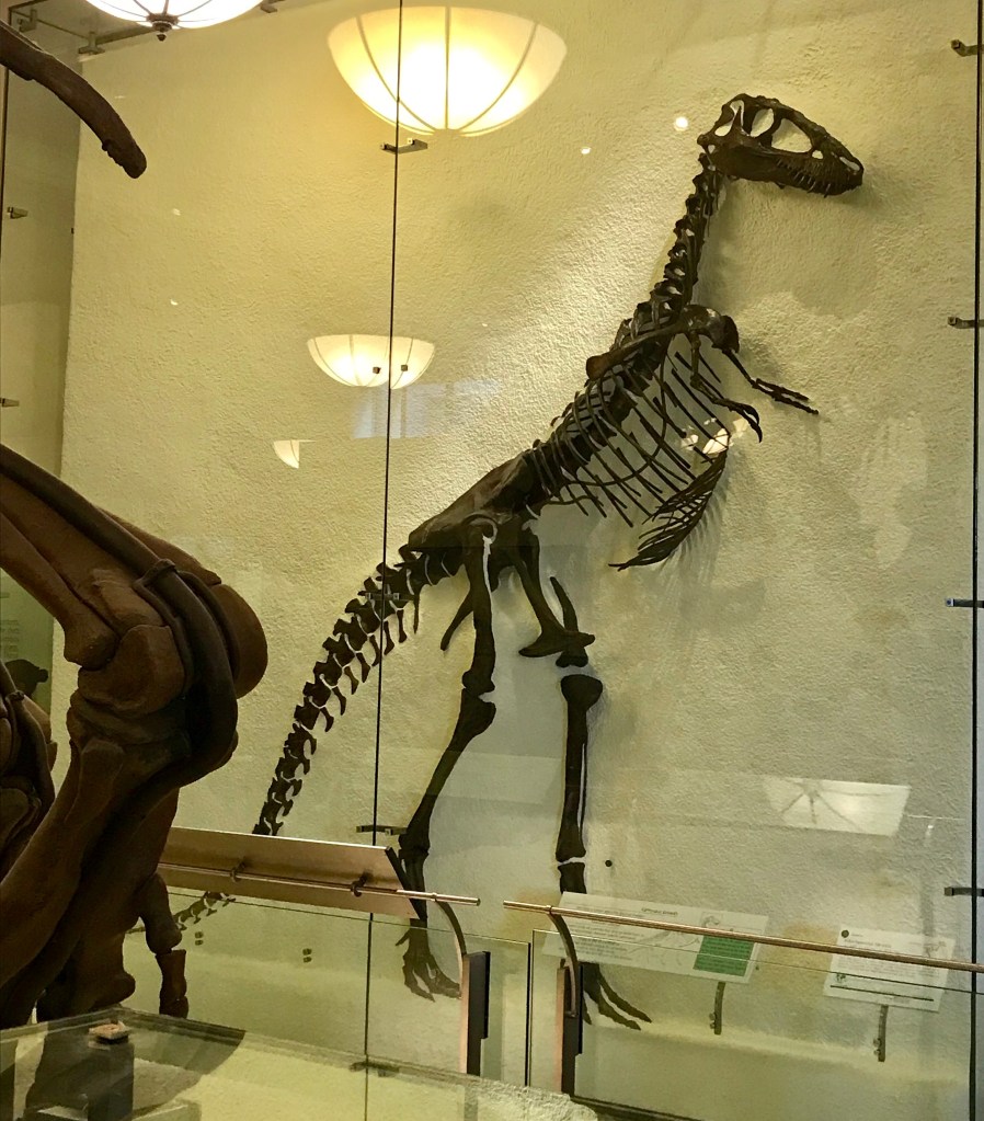1912年に大きい方(USNM 4282)と小さい方(USNM 2210)のカンプトサウルスの骨格がここに展示されたそうです。いずれもワイオミング州コモ・ブラフ産。これらはカンプトサウルスの最初のマウントを代表するものであると同時に、分類学的にはかなり複雑な歴史を持っています。 マーシュ博士は当初、両標本をカンプトサウルス・ナヌス Camptosaurus nanus と記載し、カンプトサウルス属の新種としました(模式種ディスパルもマーシュ博士が元記載)。化石をUSNMが手に入れた後、ギルモア博士は、大きい方を新種カンプトサウルス・ブロウニ Camptosaurus browniとして再記載しました。この名は1980年代まで通用しましたが、ピーター・ガルトンさんらがどっちもディスパルの成長段階だよねと指摘しました。