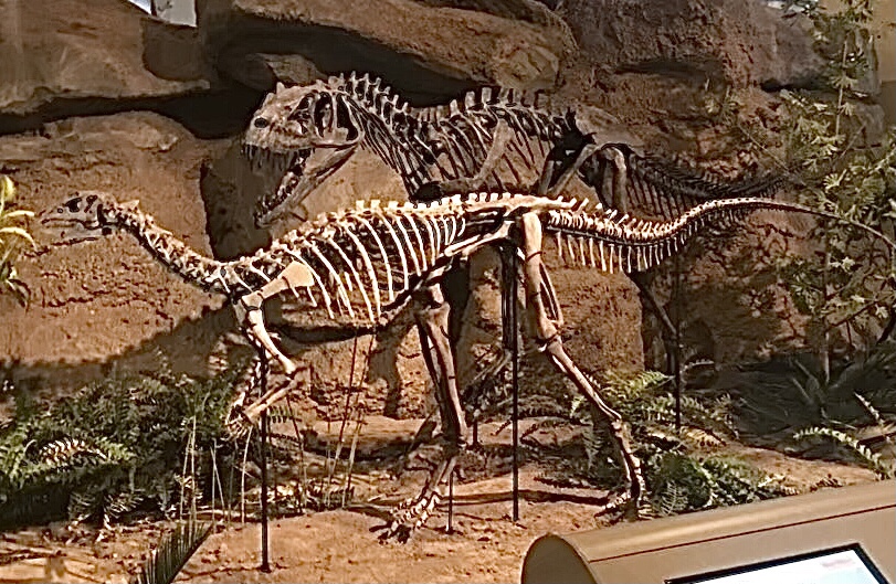 一方、小型鳥脚類であるドリオサウルスと比べられる程のサイズのこのケラトサウルス(Ceratosaurus)のマウント。良好な標本がこのサイズの個体であるためなのかどうか知りませんが、このサイズのマウントがケラトサウルスのものとしてよく見られます。これは最大サイズではなく、大型肉食恐竜と呼べるほどには大きくなる動物です。