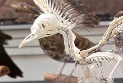 飛翔に利用される骨や筋肉、腱の構造がわかりやすく標本一体で紹介されています。翼の羽と尾羽も残されています。
