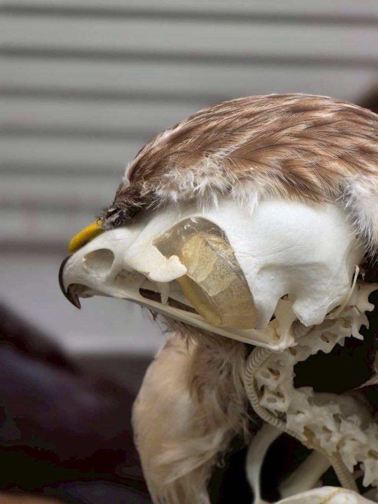 眼窩の上に眉のように骨が飛び出ているのがわかりますでしょうか。この骨は多くのタカ類に見られる構造です。ジェームズ・キャメロンの映画『アバター』のトルークと同じで、頂点捕食者は上空を警戒する必要はありません。上方からの余計な光をカットするカメラのレンズフードのようなものらしいです。この理屈は非鳥類型獣脚類にもよくある涙骨だの頭頂骨だの由来の突起とも関係あるかもしれませんね?