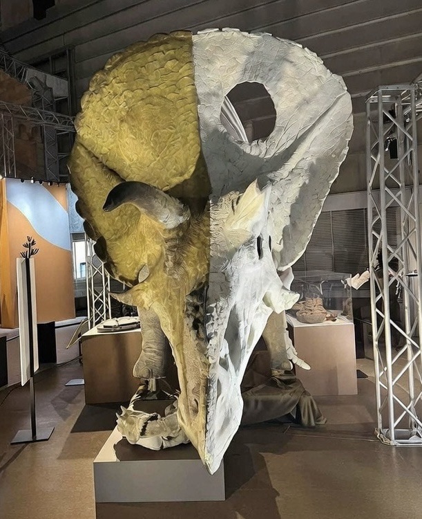 最大級の角竜 トロサウルス・ラトゥス Torosaurus latus 半分生体復元模型・半分筋肉と骨格の復元模型。