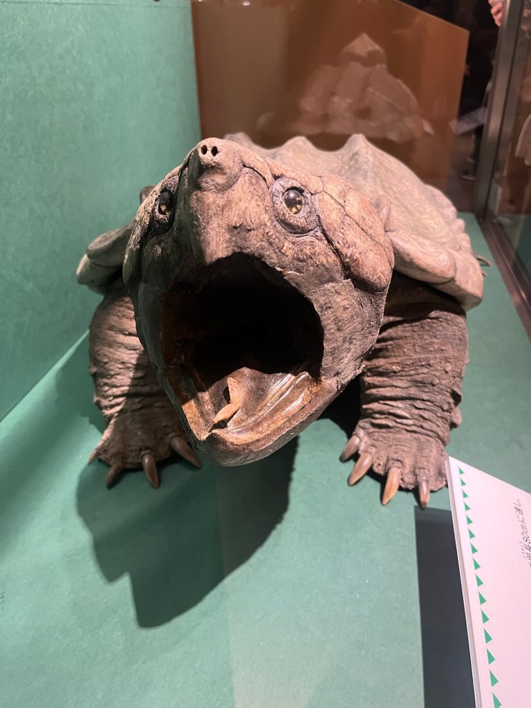 生きているワニガメは泥や苔がついていてなかなか野生味溢れる外見をしていますが、剥製はきれいに整えられているため、より親しみやすく、この標本でいうと母性本能をくすぐる表情をしていますね。