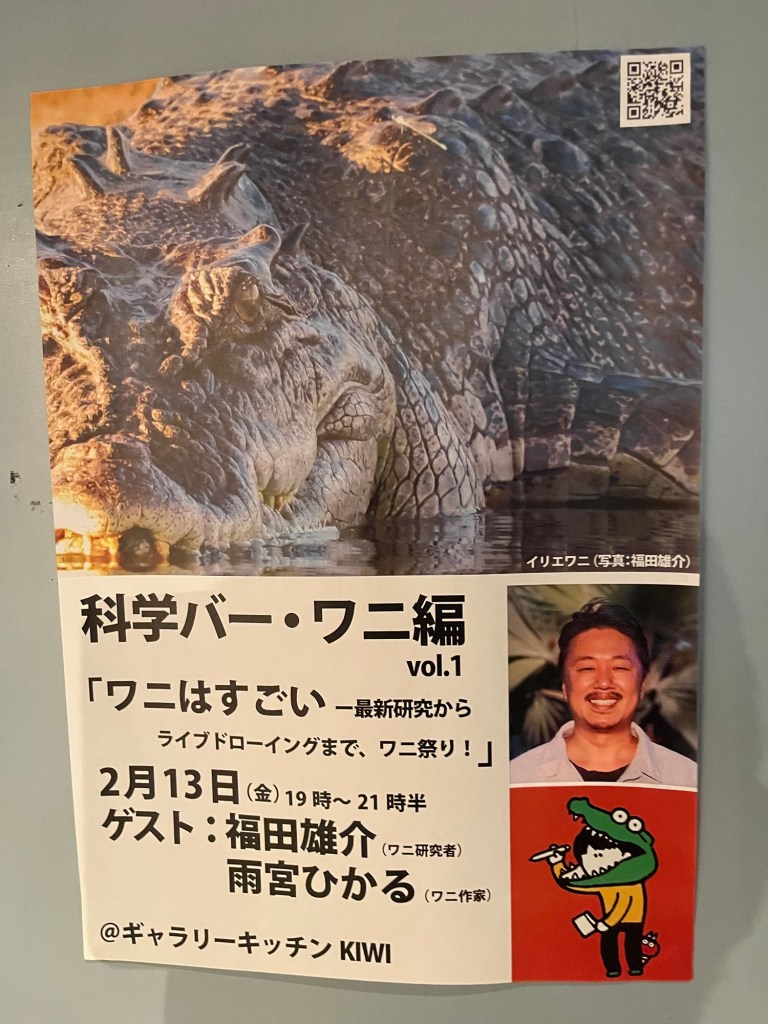 それから2月13日に小伝馬町のギャラリーキッチンKIWIで開催された『大人の科学バー・ワニ編 vol.1』にも侵入させていただきました。