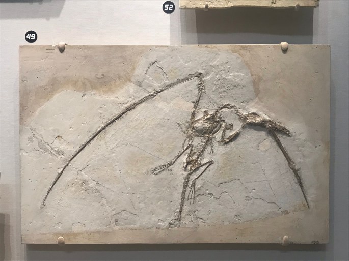 背側から見ています。尾の先、右の翼端、胸骨および烏口骨を除き完全な標本。翼竜の翼膜が脛骨の外側に付着していることを示す最適な標本としてこの標本を扱っていますが、正直この標本を見てもよくわかりません。