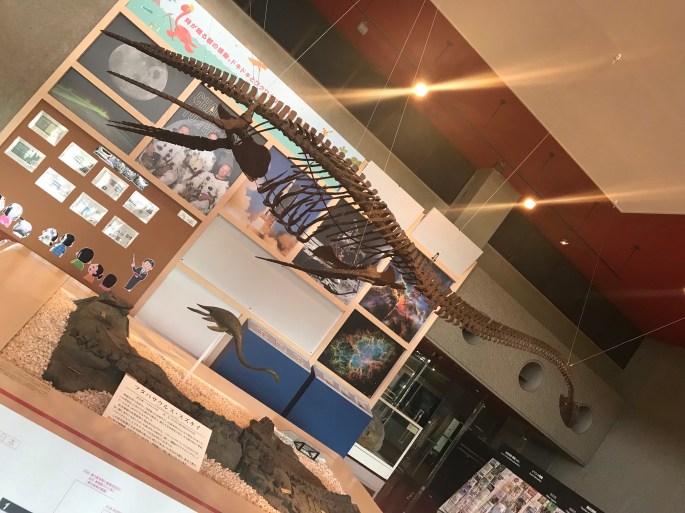 いきなりフタバスズキリュウ復元骨格が出迎えます(レンズ拭こうか)。