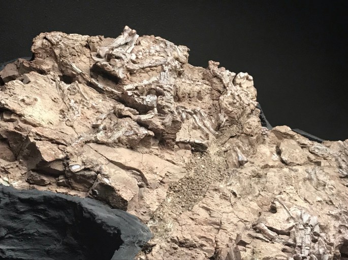 この標本は鉱山のトンネルの天井側にあるのが発見されたもので、その現場を再現した展示もありました。上の写真がそうなんですが、横のアングルから凸になった足跡を撮っているのでわかりづらいですね。