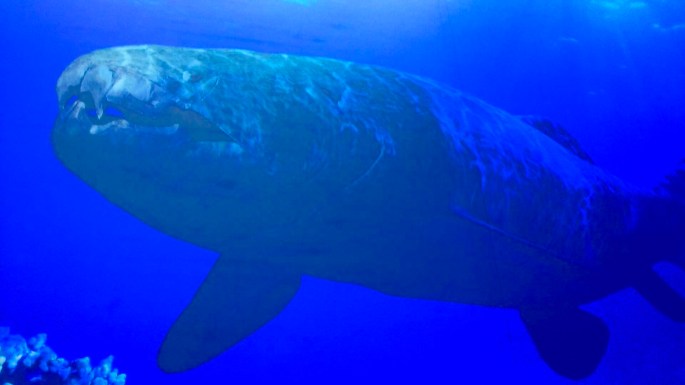 おそらく最も有名な甲冑魚 ドゥンクレオステウス(ダンクルオステウス) Dunkleosteus。斬新な手法で生体の様子を表現しております。