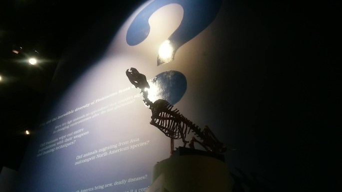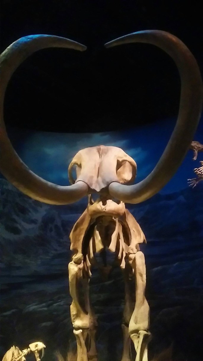 マンモス Mammothus とスミロドン Smilodon のからみを描き出した躍動感のある展示。