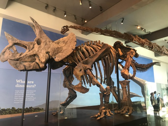 ほぼ最初に観ることになるのが施設中央に存在するこちらの展示。トリケラトプス・プロルスス Triceratops prorsus ティラノサウルス Tyrannosaurus rex の人気コンビ。