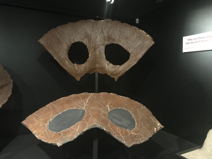 ブセンバークの頭頂骨。下が実骨。上がそのレプリカで裏側を見せています。(実骨の両面を観れるように展示することはできなかったのだろうか🤔)