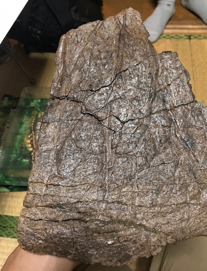 ☝️所十三さん所蔵のトリケラのフリル。溝が走っていますがこれが静脈の痕跡で、老齢である証拠らしい(参考までに)。
