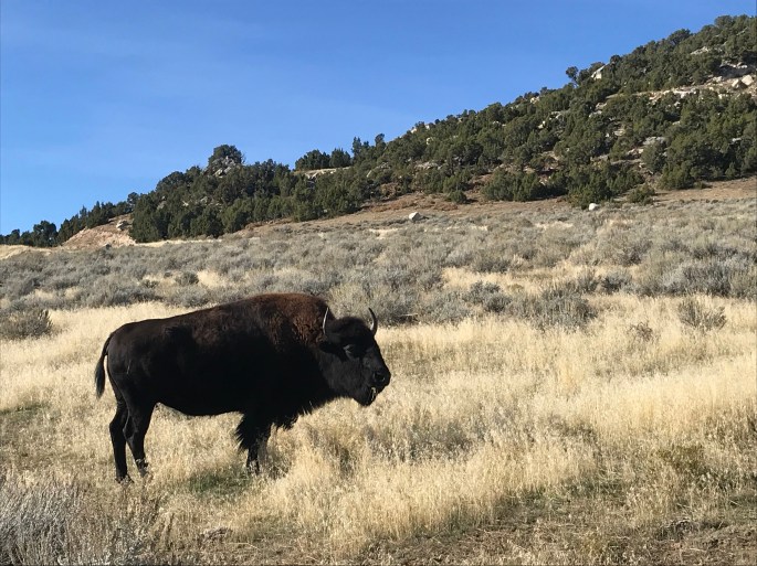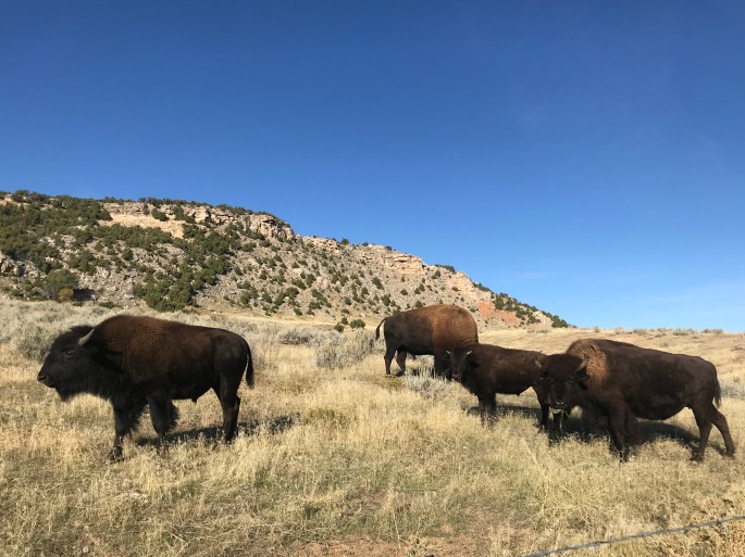 サーモポリス近郊の放牧地にウシがいると思ったら、アメリカバイソン Bison bison でした。近づいたら柵に向かって突進(寸止め)されました。