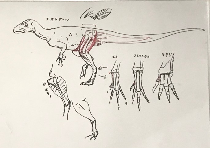 エオラプトルの第5趾は第4趾の後ろに回り込んでいる。第1中足骨が踵の関節まで来ている。