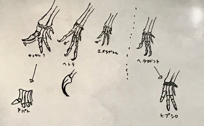 竜脚類は手指が5本あるように見えるが、実際は1本もない。指をガンガン使う歩き方ではなく、ナックルウォークのように伝い歩きをした。そもそも前肢が歩行に向いていない構造だからそうなのだろうと言えそう。
