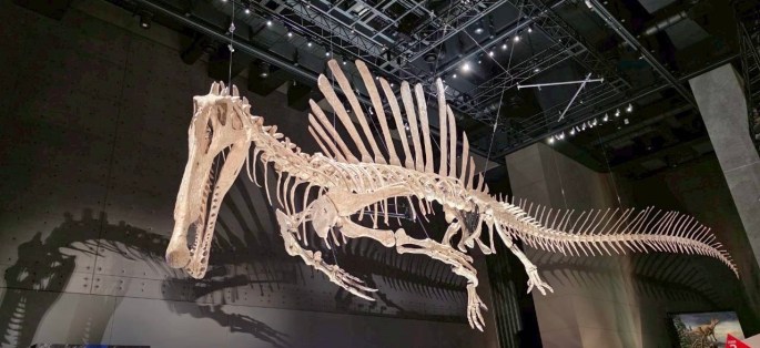また、尾がウナギみたいな感じで扁平になっているのがあそこ、いのちのたび博物館のスピノサウルスよりも新しい復元である事が一目瞭然です。